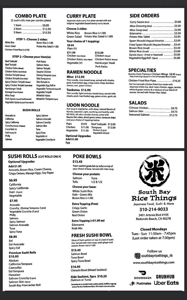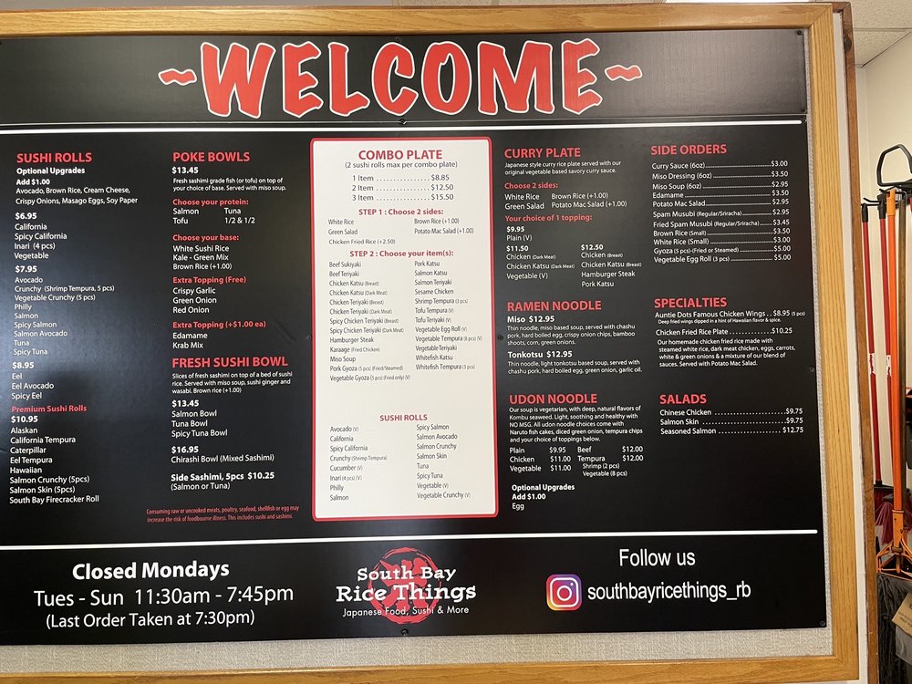 Rice Things, a Japanese sushi bar located in Redondo Beach, offers a wide range of menu options including sushi rolls, fresh sushi bowls, and combo plates. The Alaskan Sushi Roll with salmon and avocado, the Chirashi Bowl with sashimi slices, and the Combo Plate with multiple items are popular choices among customers. With vegan and vegetarian options available, Rice Things caters to diverse dietary preferences. Customers praise the affordable prices and good quality of the food. Some have noted occasional inconsistencies in certain dishes but overall enjoy the generous portions and flavorful offerings. The casual atmosphere, attentive service, and varied menu make Rice Things a go-to spot for Japanese-American cuisine enthusiasts. Don't miss out on the happy hour specials, outdoor seating, and convenient options for takeout and delivery.